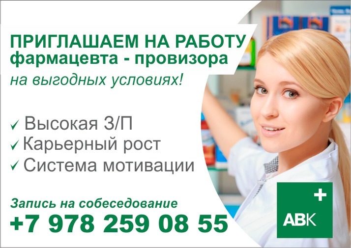 Сеть современных аптек "АВиК" с профессиональным подходом, доступными ценами, гарантией качества, широким ассортиментом лекарственных препаратов, косметики и медицинских товаров приглашает на работу провизоров-фармацевтов.